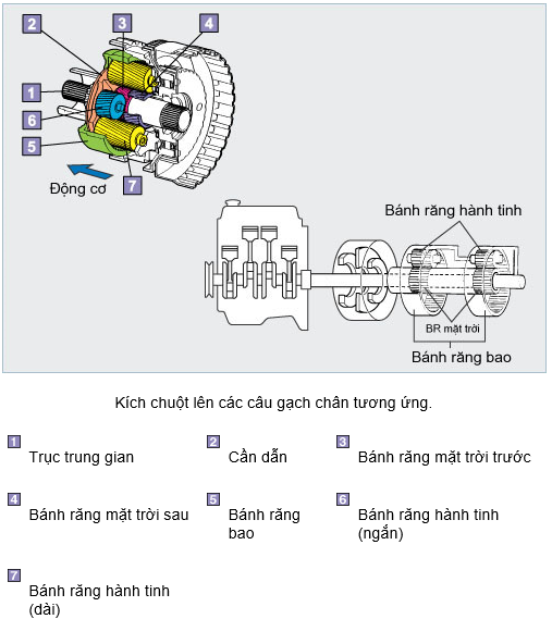 Hoạt động chuyển số được mô tả bằng mô hình bao gồm một bộ bánh răng hành tinh.